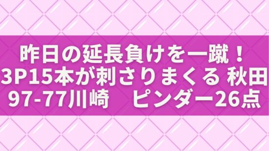 昨日のGAME1は、あと一歩で勝ち切れたのに延長で崩れてしまった。あの悔しさが残る中で迎えたGAME2。結論から言うと、今日は秋田が頭も足も止めずに最後まで走り切って、川崎の反撃の芽を潰し続けた試合でした。今季最多97得点、3Pは15本、ベンチポイントは51。これはバイウィーク明けの再スタートだと言わんばかりの内容です。