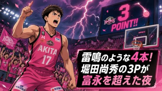 雷鳴のような4本!堀田尚秀の3Pが富永を超えた夜!復帰ピンダーの献身とヤニーの咆哮が照らした秋田の光